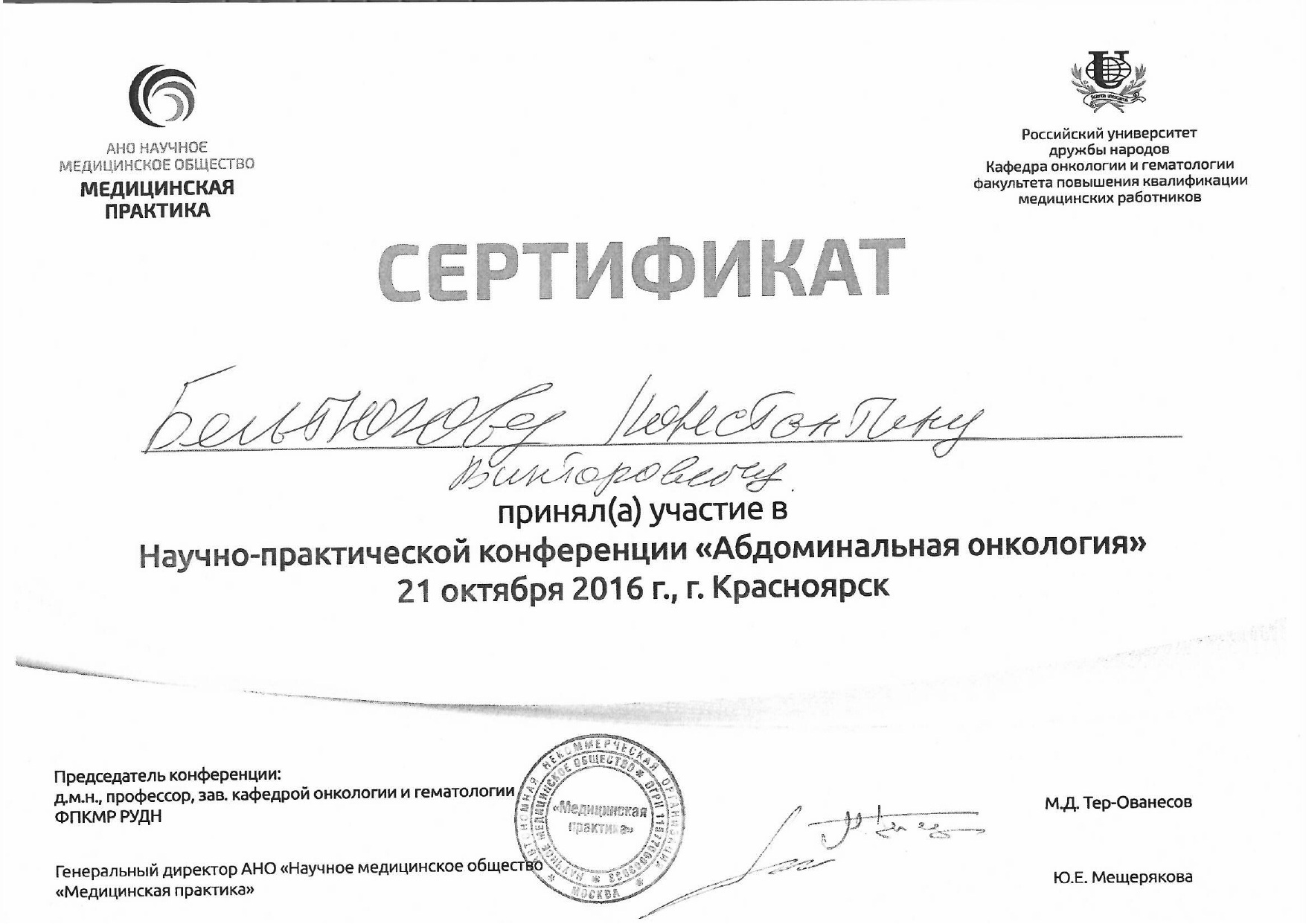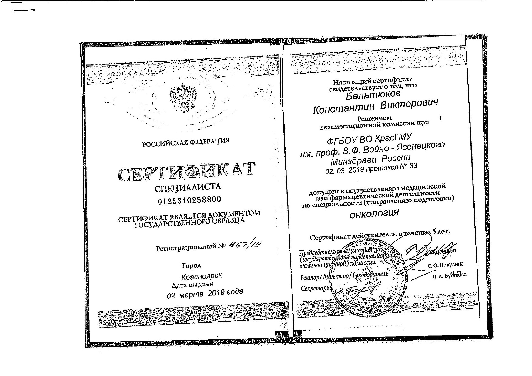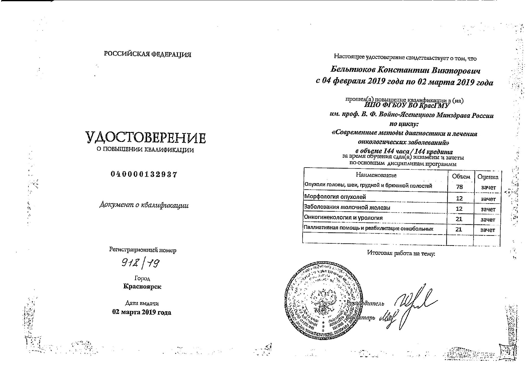 2019 год, онкология (повышение квалификации). Красноярский государственный медицинский университет имени профессора Войно-Ясенецкого