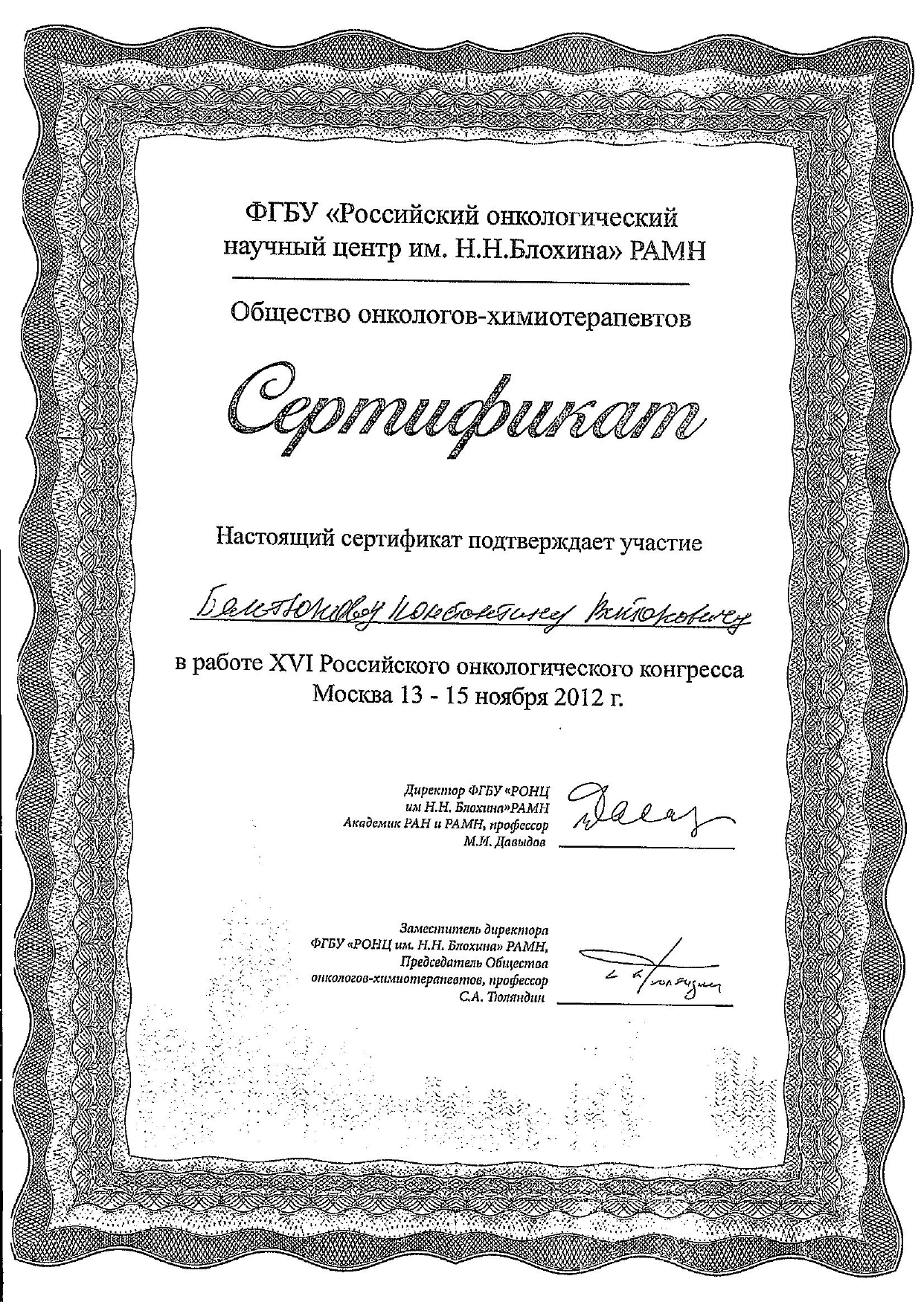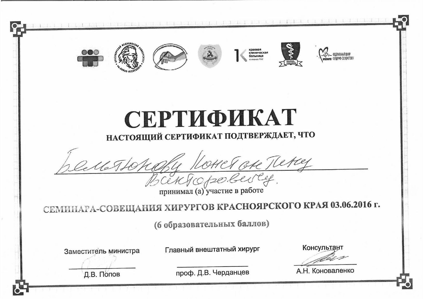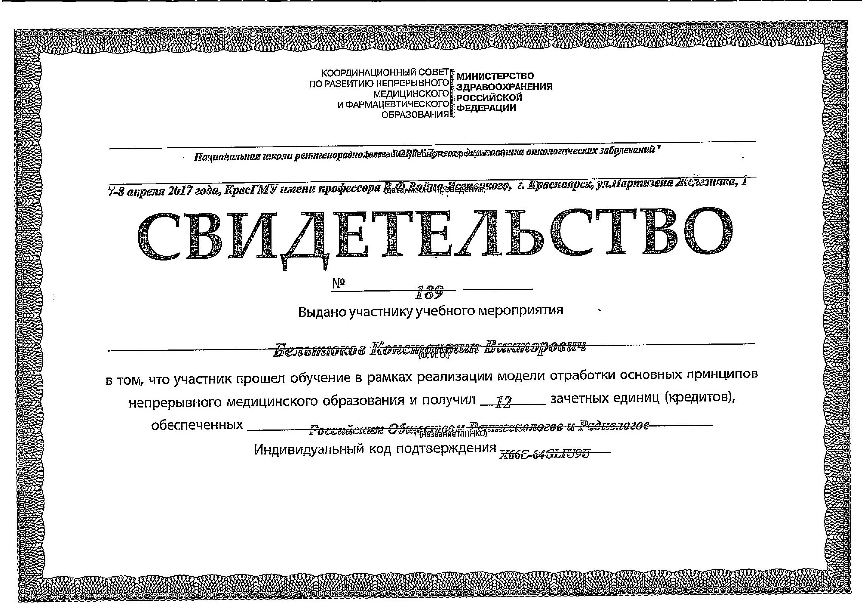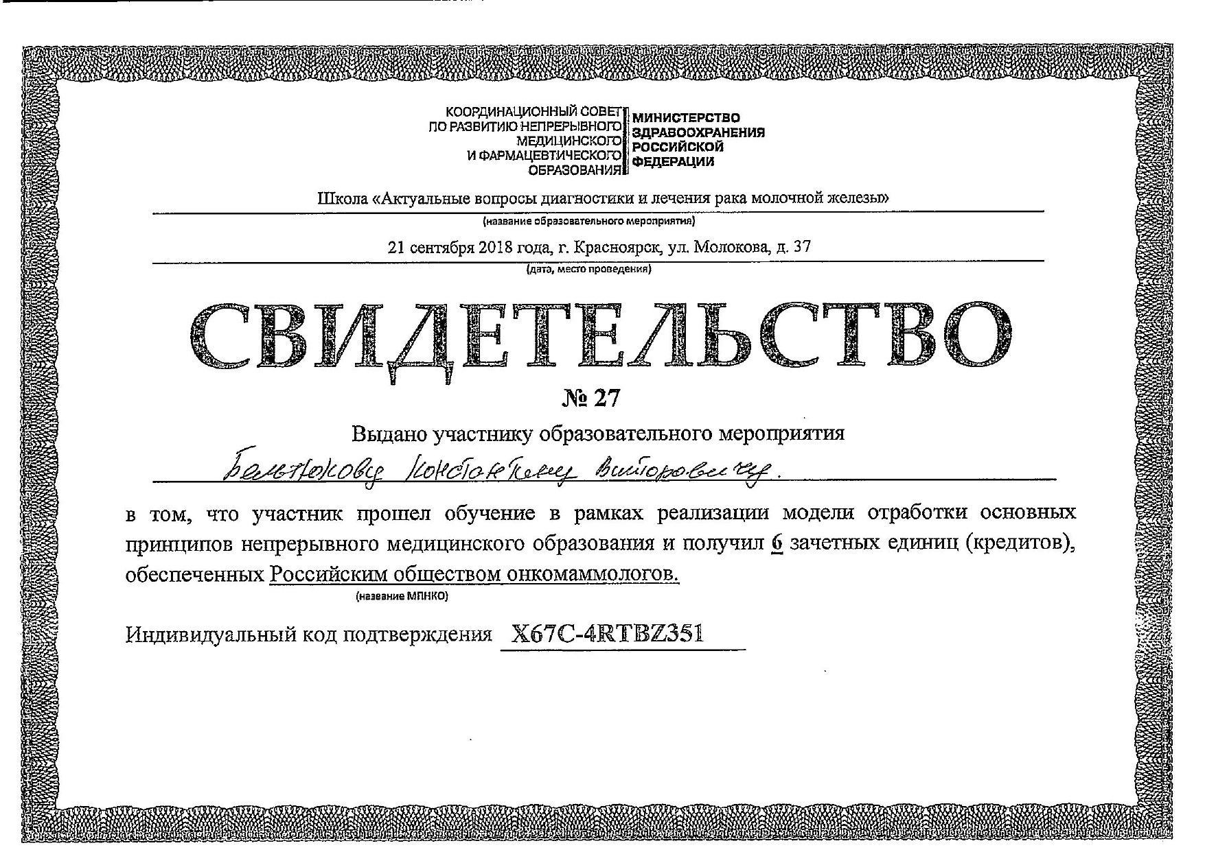 2019 год, онкология (повышение квалификации). Красноярский государственный медицинский университет имени профессора Войно-Ясенецкого