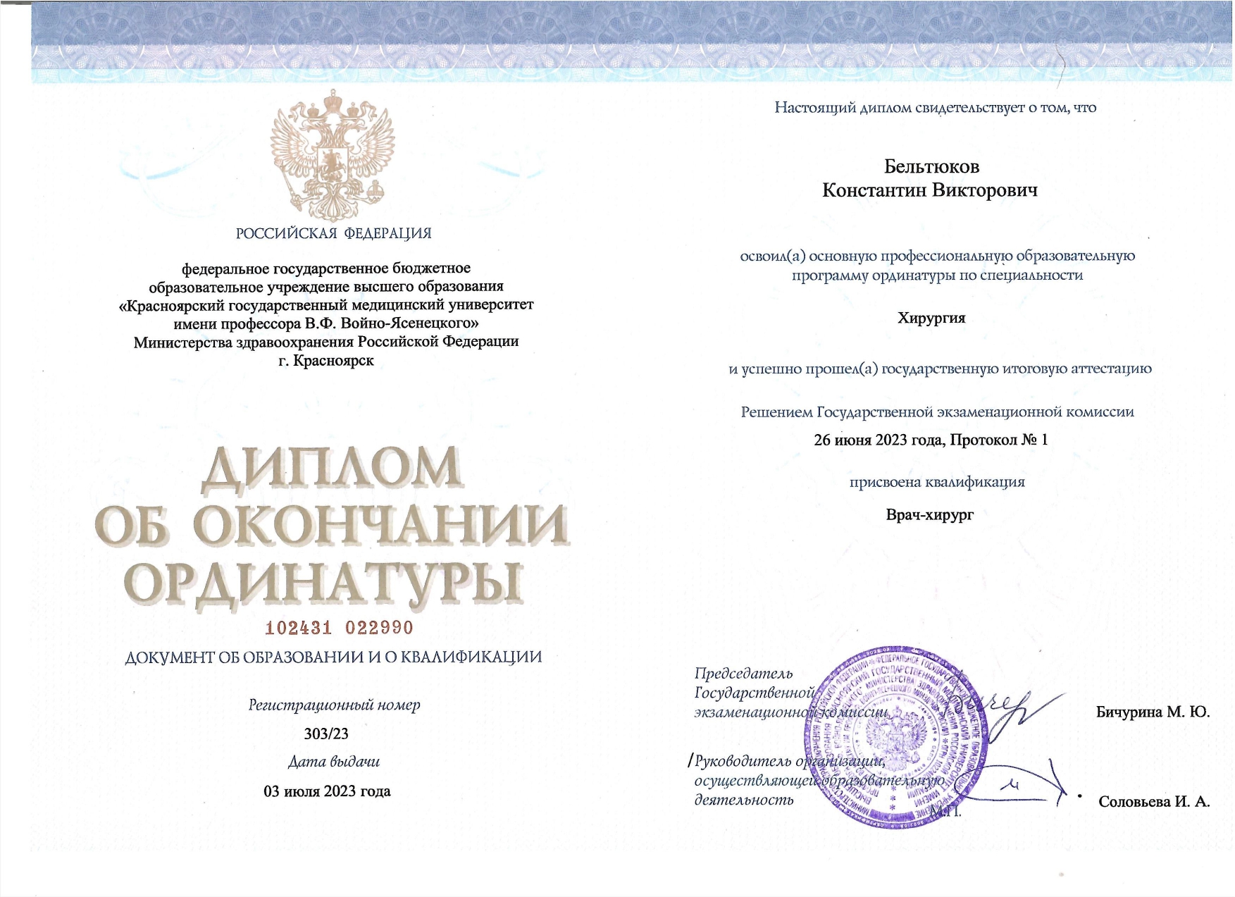 2023 год, хирургия (ординатура). Красноярский государственный медицинский университет имени профессора Войно-Ясенецкого