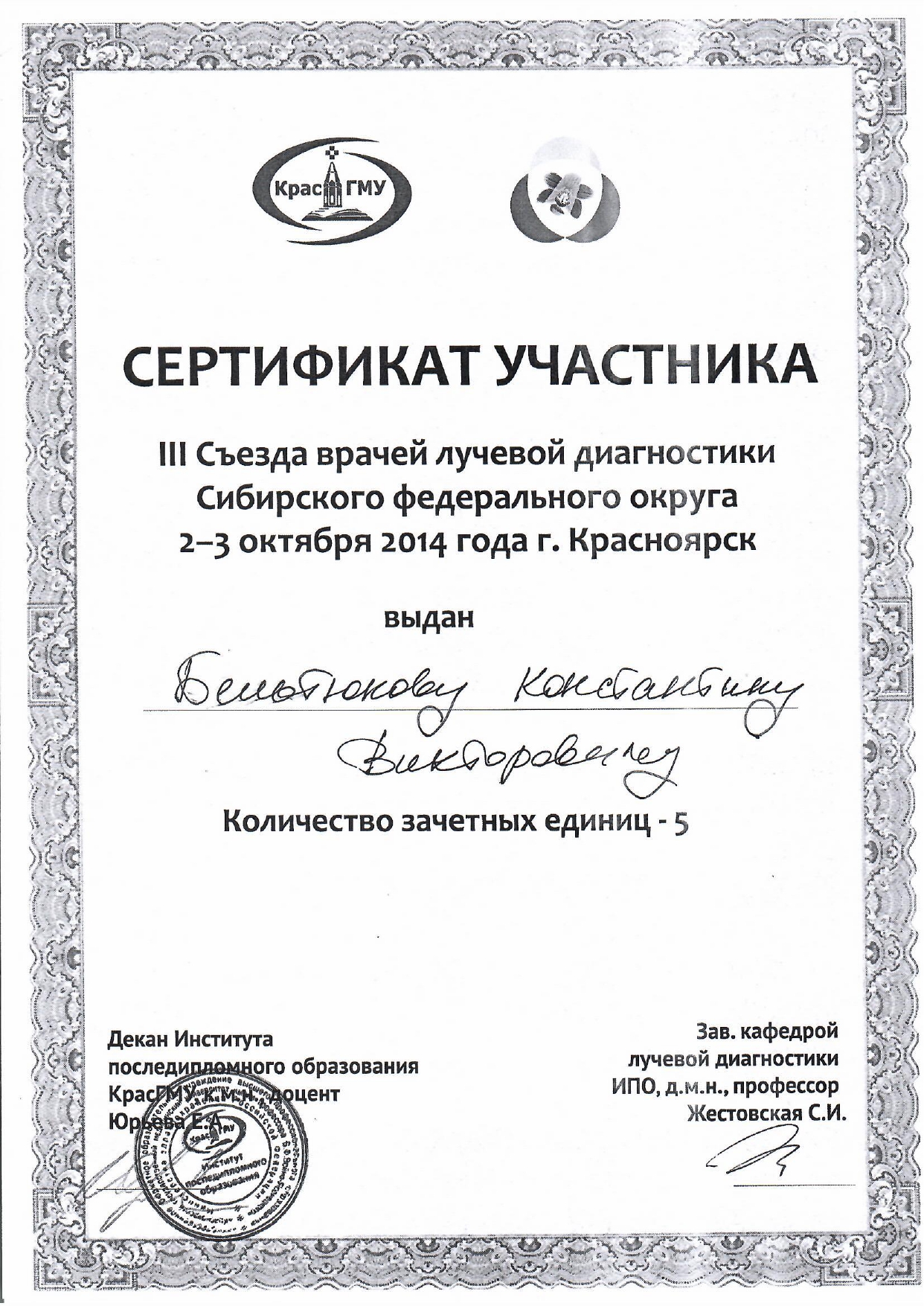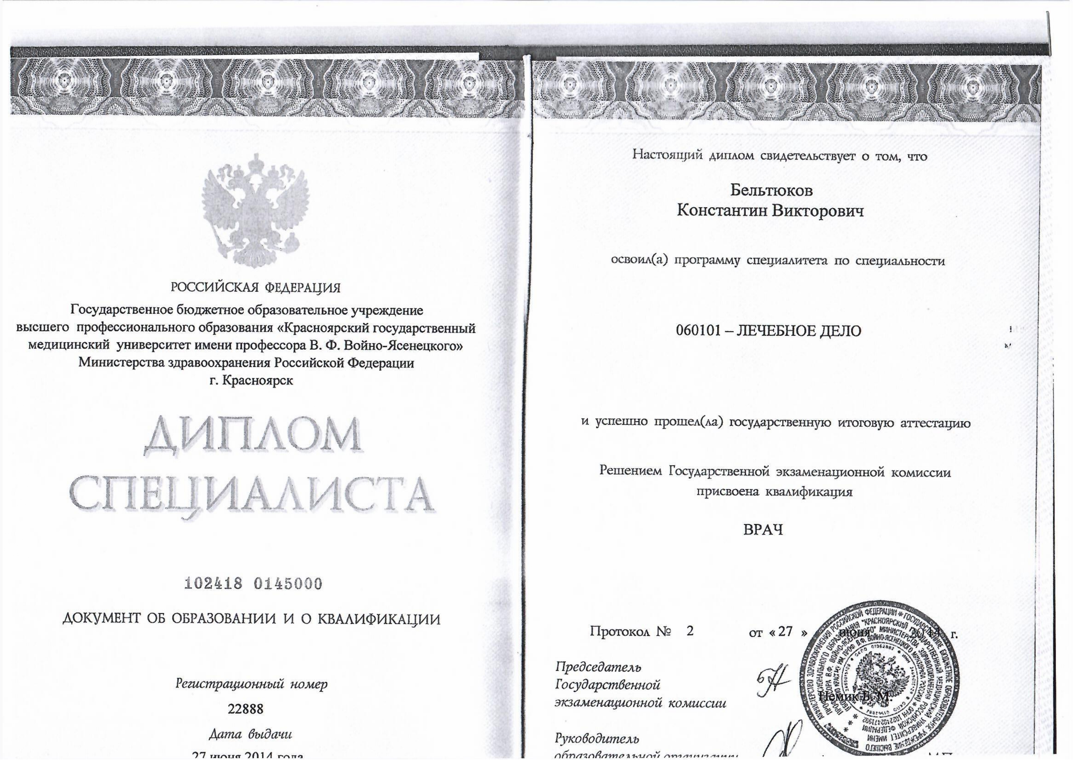 2014 год, лечебное дело (базовое образование). Красноярский государственный медицинский университет имени профессора Войно-Ясенецкого