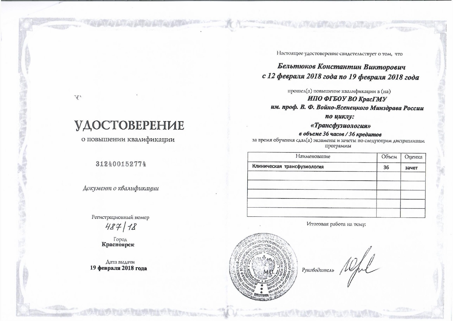 2018 год, клиническая трансфузиология (повышение квалификации). Красноярский государственный медицинский университет имени профессора Войно-Ясенецкого