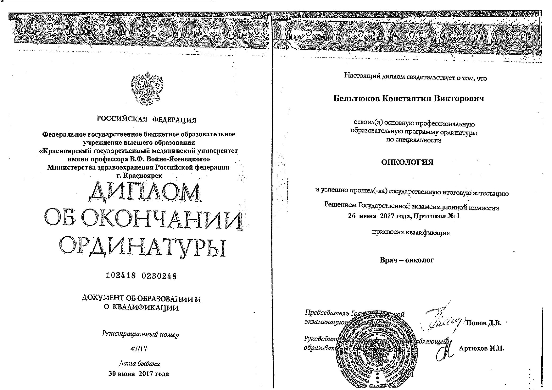 2017 год, онкология (ординатура). Красноярский государственный медицинский университет имени профессора Войно-Ясенецкого