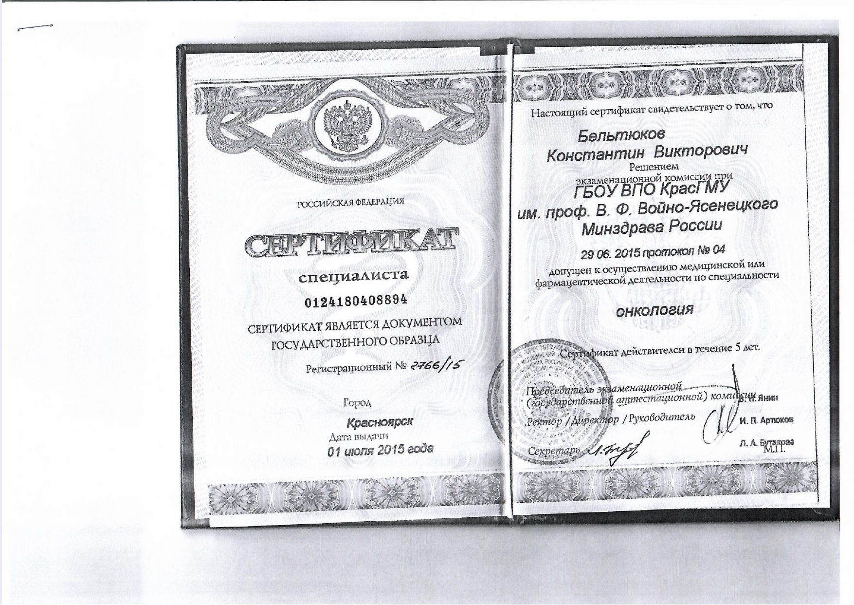 2015 год, онкология (интернатура). Красноярский государственный медицинский университет имени профессора Войно-Ясенецкого